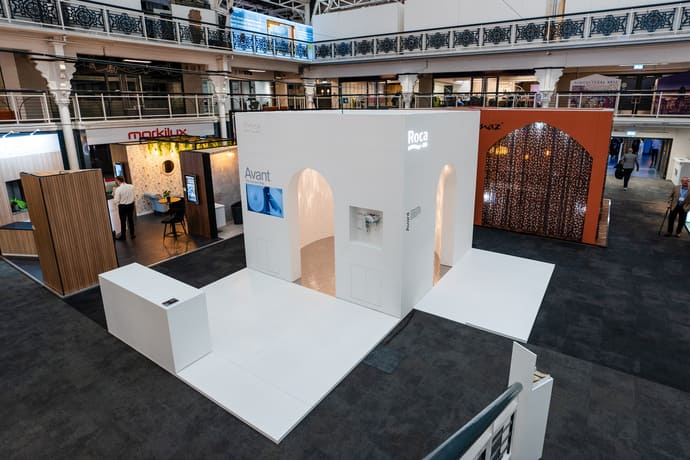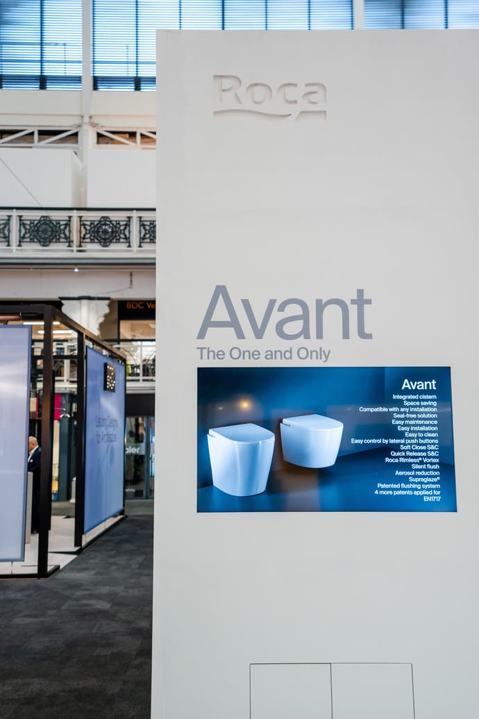 This unique space, with its reflective floor and ambient light and sound installation, housed a preview of Roca’s innovative Avant WC, which seamlessly integrates the cistern within the WC pan, in both floor-standing and wall-hung versions.
