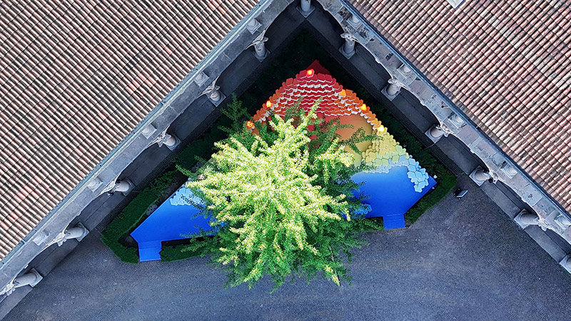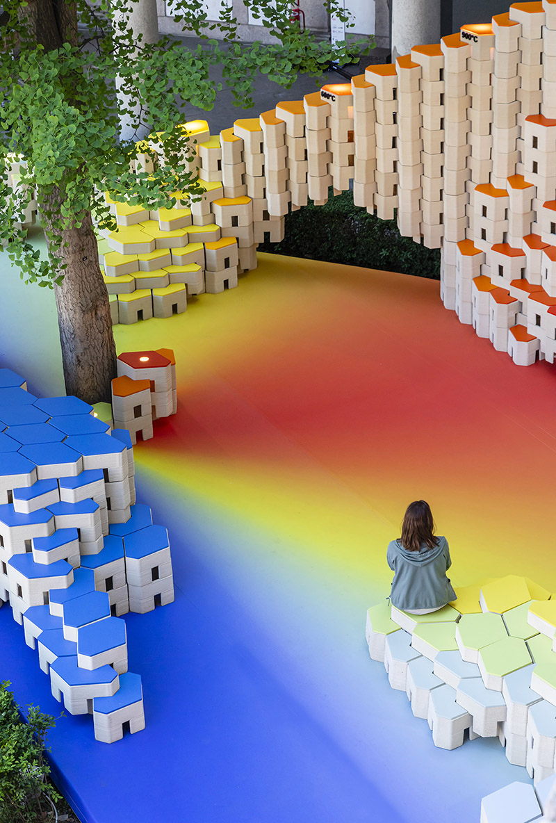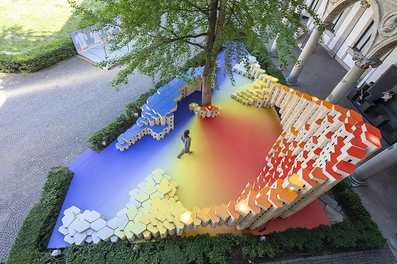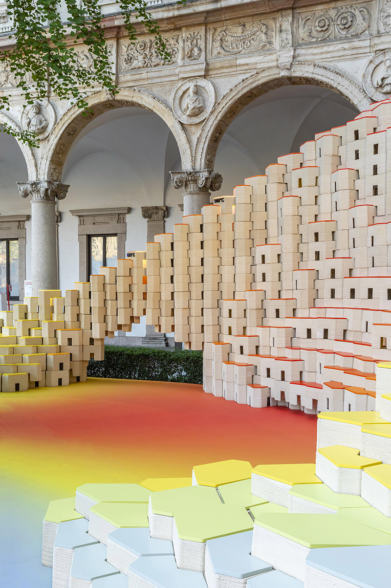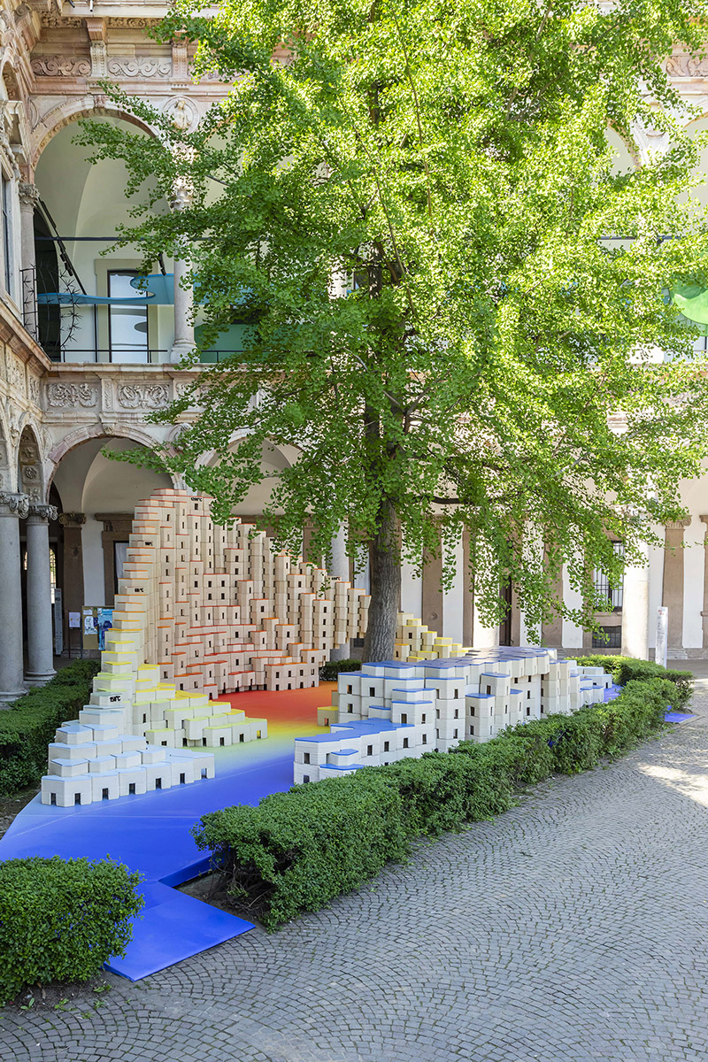 The installation's elegantly curved design with varying heights fits perfectly into the triangle-shaped plot and blends effortlessly into the courtyard of the University of Milan, offering a range of spatial and functional possibilities. More than just visually appealing, these versatile blocks become part of the narrative, transforming into inviting seating areas that encourage visitors to unwind, engage in conversation, and socialise in this dynamic space.