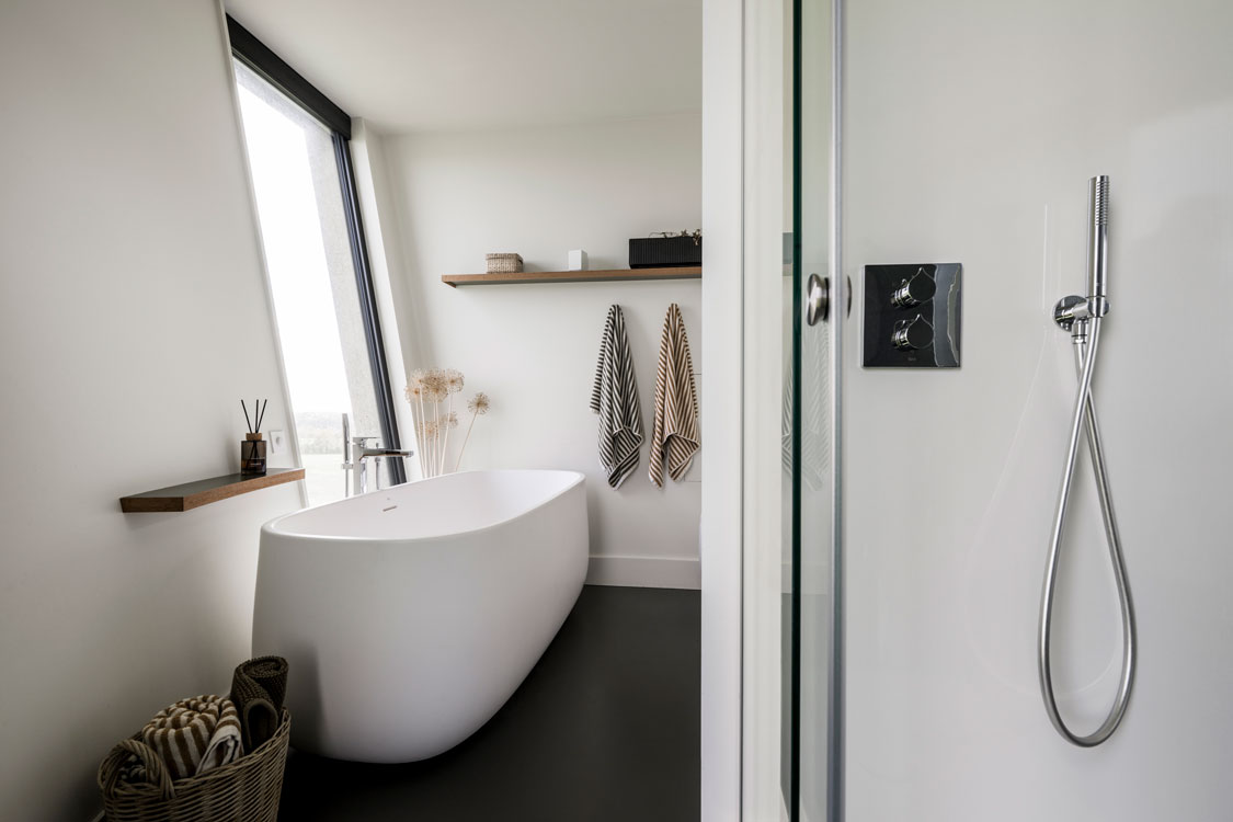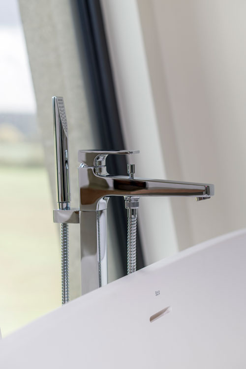 At the heart of the design is the main ensuite, fitted with Roca’s sculptural Beyond collection in matt white—including the Beyond Totem basin, freestanding bath shower mixer and WC. The soft curves reflect the tower’s cylindrical form, enhancing the sense of harmony throughout.