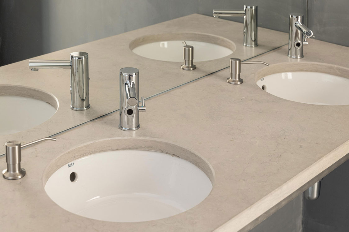 | Roca Products | Foro undercountertop basin, Inspira Round wall-hung Roca Rimless® toilet, Euret electronic urinal, Meridian wall-hung basin, Access folding grab bar |