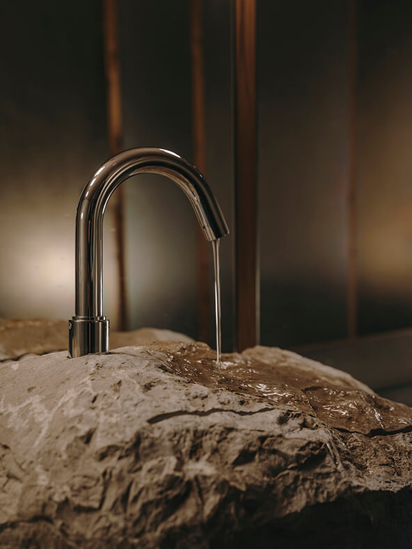Adding to this atmosphere of understated sophistication, the Loft electronic faucet combines refined geometry with intuitive functionality. Its sleek, cylindrical silhouette and architectural spout lend a sense of modern precision, while integrated touchless technology enhances both hygiene and ease of use. With water activated by a simple wave of the hand, the Loft faucet offers a user experience that is as elegant as it is efficient.