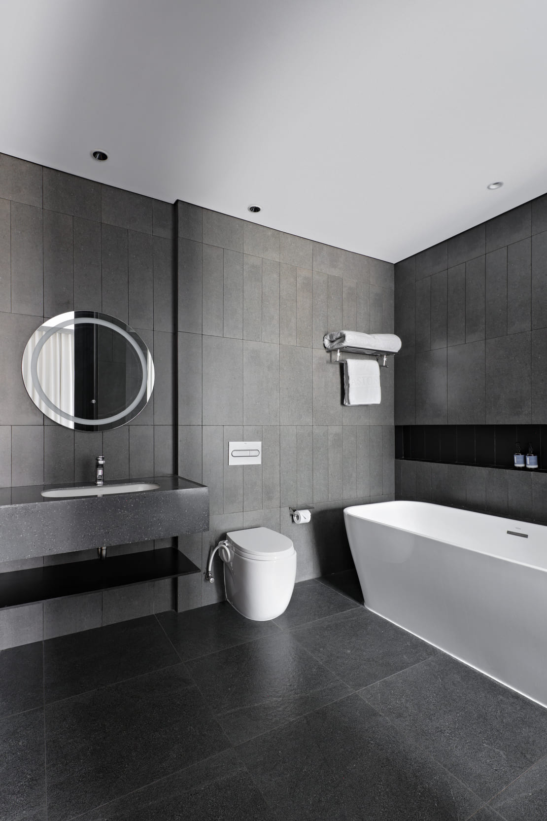 Each bathroom is designed according to the specific layout and needs of the space, with a carefully selected mix of under- and over-countertop basins from collections such as Neo-Selene, Inspira, The Gap, Berna and Debba. Neo-Selene, for example, brings elegant minimalism through smooth lines that blend easily into contemporary settings.