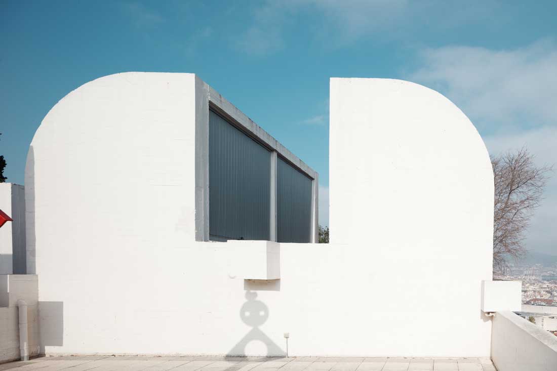 Constructed of white concrete and artificial stone with a marble grain, the structure conveys a sense of monolithic simplicity. Its restrained palette – whitewashed and luminous – reflects a Mediterranean identity and contrasts gently with the surrounding greenery of Montjuïc.