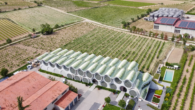 Sustainability and technological innovation are at the heart of Mastinell Cava & Hotel’s design philosophy. The building’s continuous, undulating roof shapes spaces without the need for internal walls, creating a fluid, open environment ideal for cross-ventilation. This design approach not only enhances the visual appeal, but also minimises the environmental footprint. The hotel's sustainable architecture includes features such as the collection and reuse of rainwater and a biomass boiler, exemplifying best practice in sustainable building. These elements ensure efficient energy use and water conservation, reinforcing the hotel's commitment to environmental responsibility.